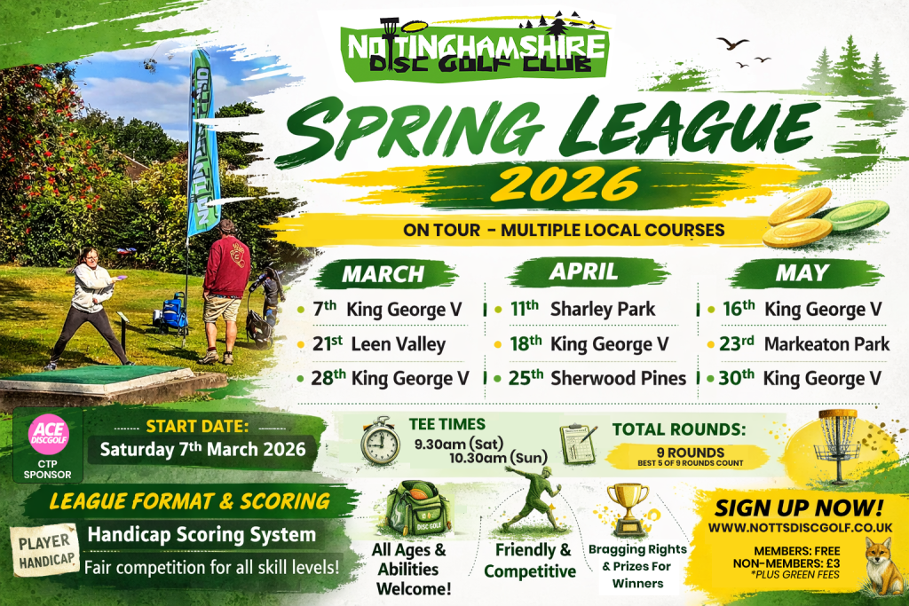 The Nottinghamshire Disc Golf Club Spring League 2026 is here, and we’re excited to invite players of all ages and abilities to join us for a fun, friendly, and competitive league at Multiple local courses this spring.